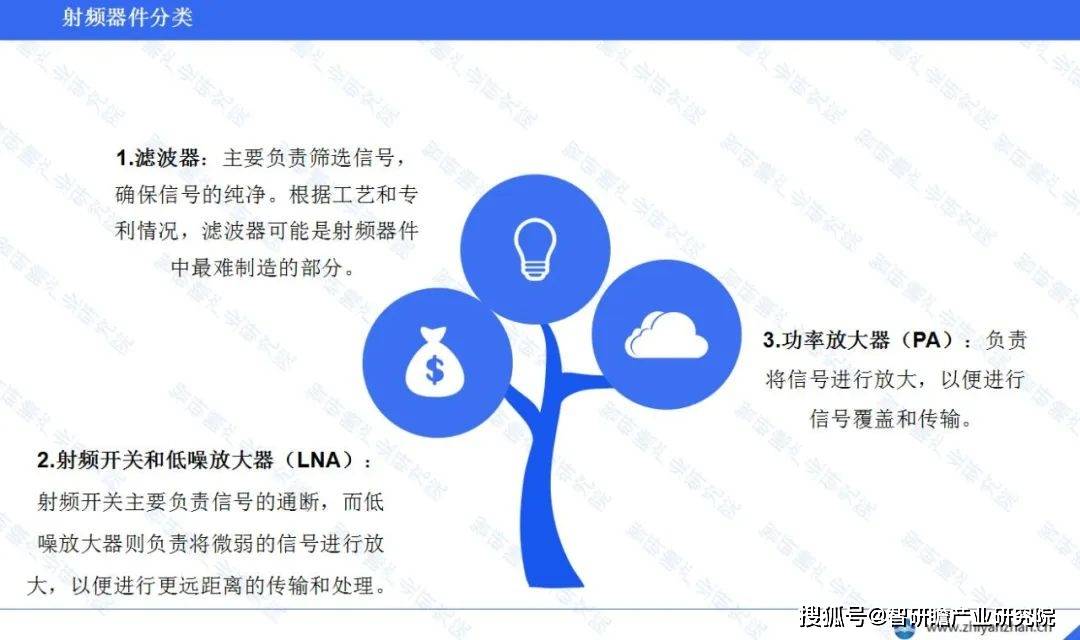 射频器件主要分为射频滤波器、射频开关和低噪放大器(LNA)、功率放大器(PA)三大类。滤波器负责筛选信号,确保信号纯净度;射频开关则负责信号的通断,而低噪放大器则将微弱信号进行放大,以便更远距离的传输和处理;最后,功率放大器则将信号进行放大,以便进行信号覆盖和传输。