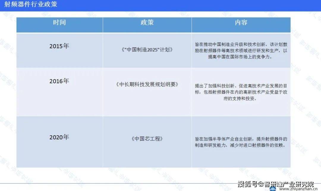 射频器件行业政策主要聚焦于推动技术创新和产业升级,鼓励企业加大研发投入,提升产品技术水平和质量。政策支持主要集中在关键核心技术的研发、产业化应用以及市场竞争环境优化等方面。同时,政府还强调加强国际合作,引进国外先进技术和管理经验,推动我国射频器件行业的全球竞争力。此外,政府也关注射频器件行业的发展对环境和资源的影响,制定了一系列环保和能源节约政策,以实现可持续发展。