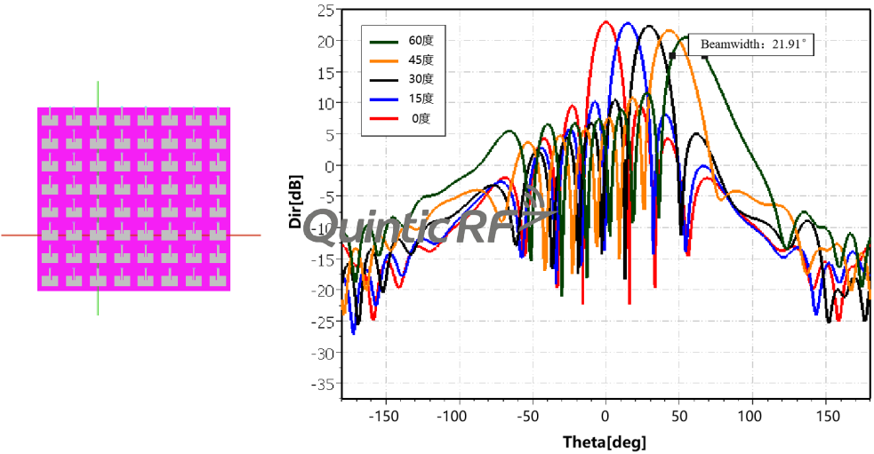 图2、8x8天线阵及其在不同扫描角下的方向图